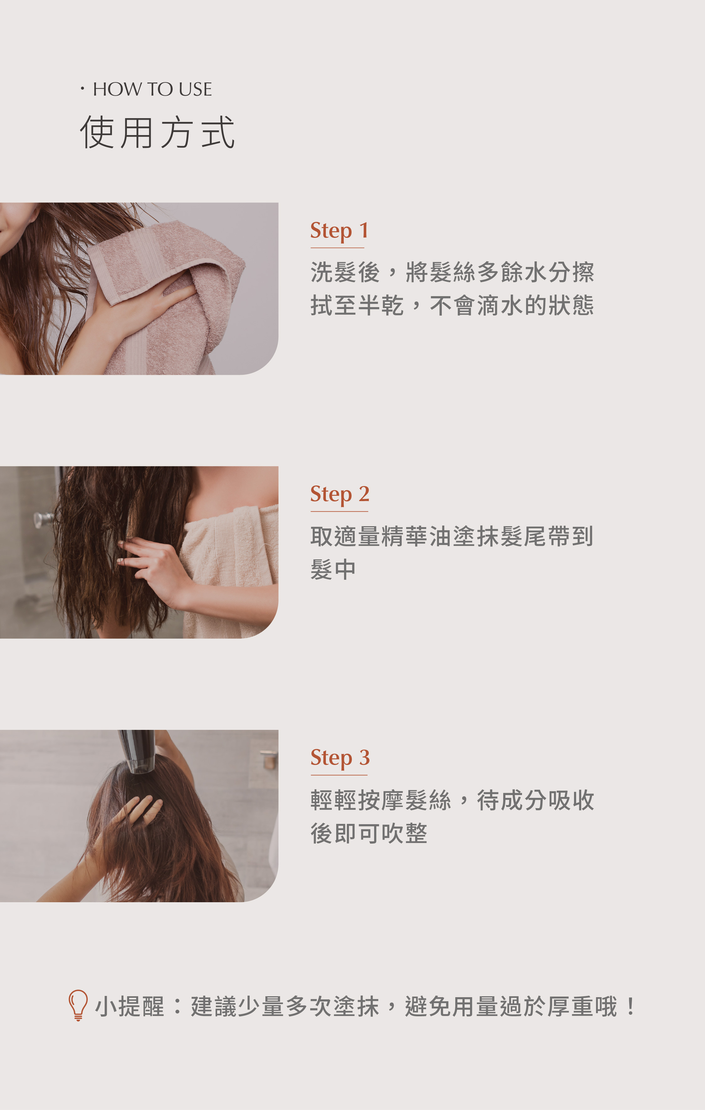可防止頭髮靜電及熱傷害。同時改善髮絲乾燥,使頭髮柔順光亮。