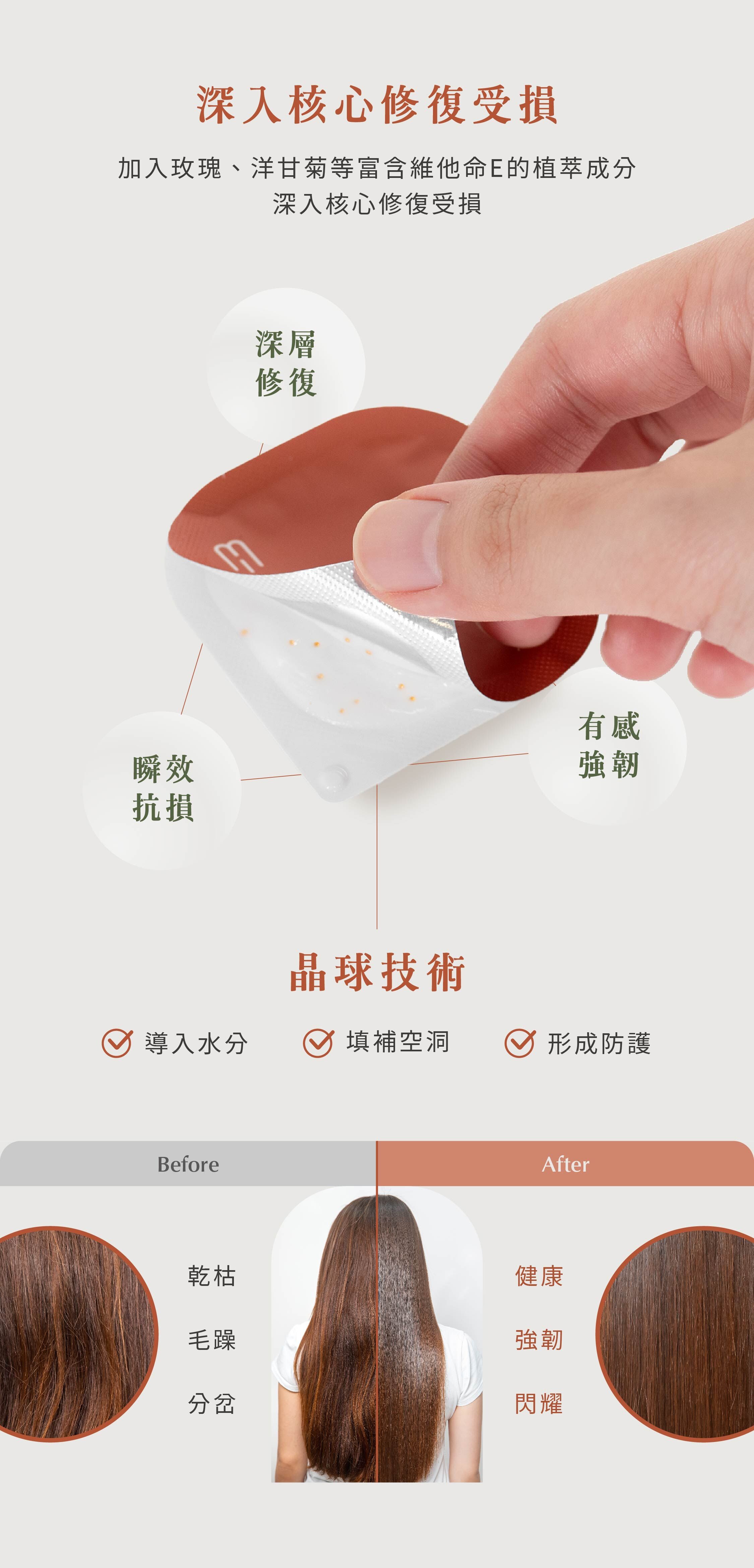 結合獨特 #晶球技術 與強效 #補水因子,並添加玫瑰、洋甘菊等富含維他命E的植萃成分,能深入核心修復受損,改善乾枯、毛躁與分岔,重現健康強韌、柔順閃耀的髮質。